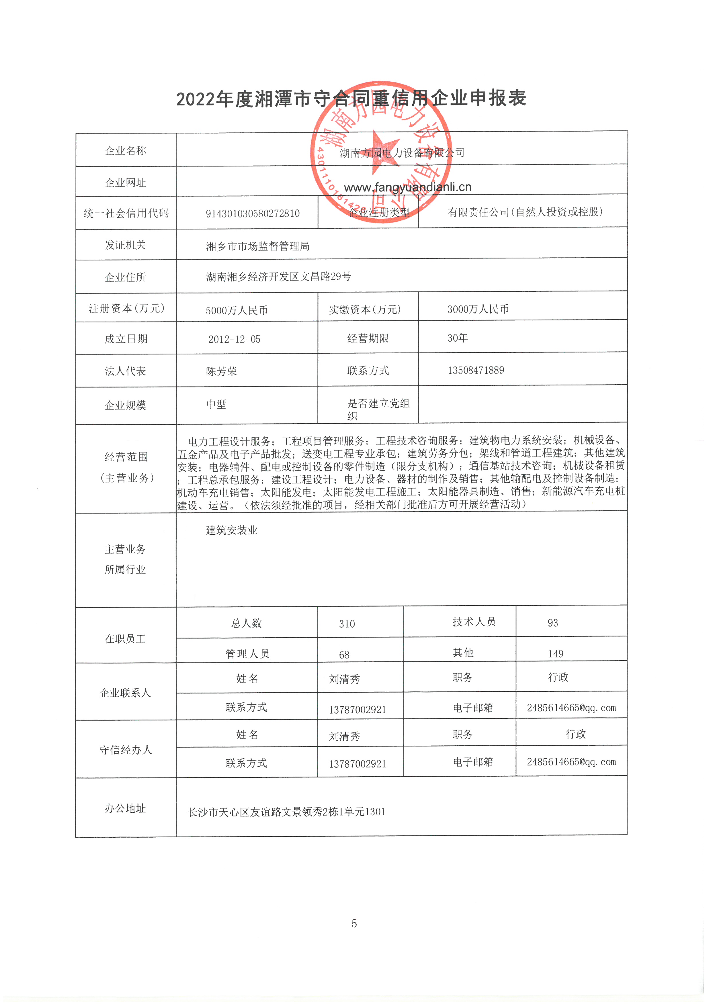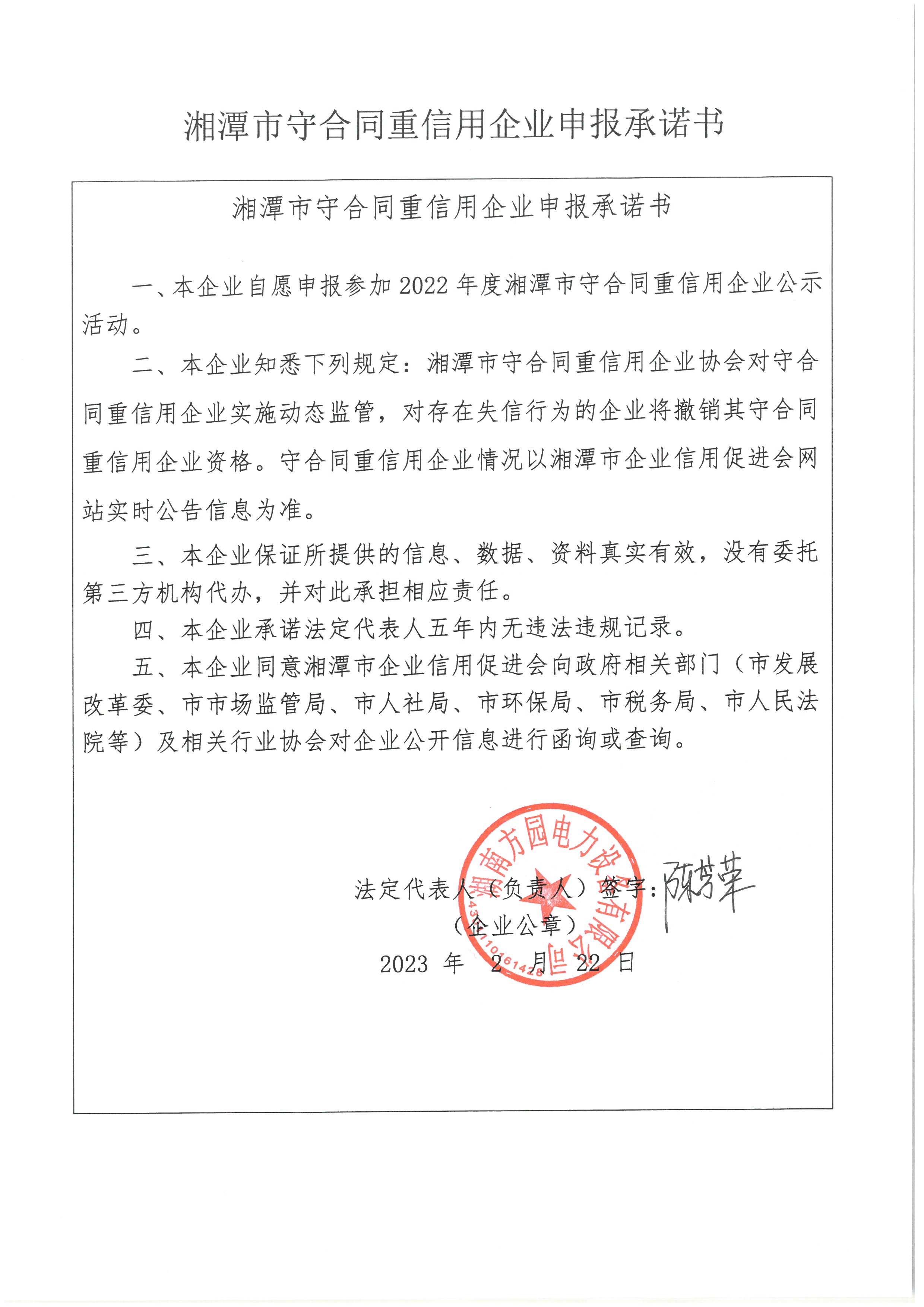 本企業(yè)根據(jù)《湘潭市守合同重信用企業(yè)申報(bào)規(guī)定》等編制 2022 年度企業(yè)信用報(bào)告書,并保證本報(bào)告書內(nèi)容真實(shí)、準(zhǔn)確、完整。