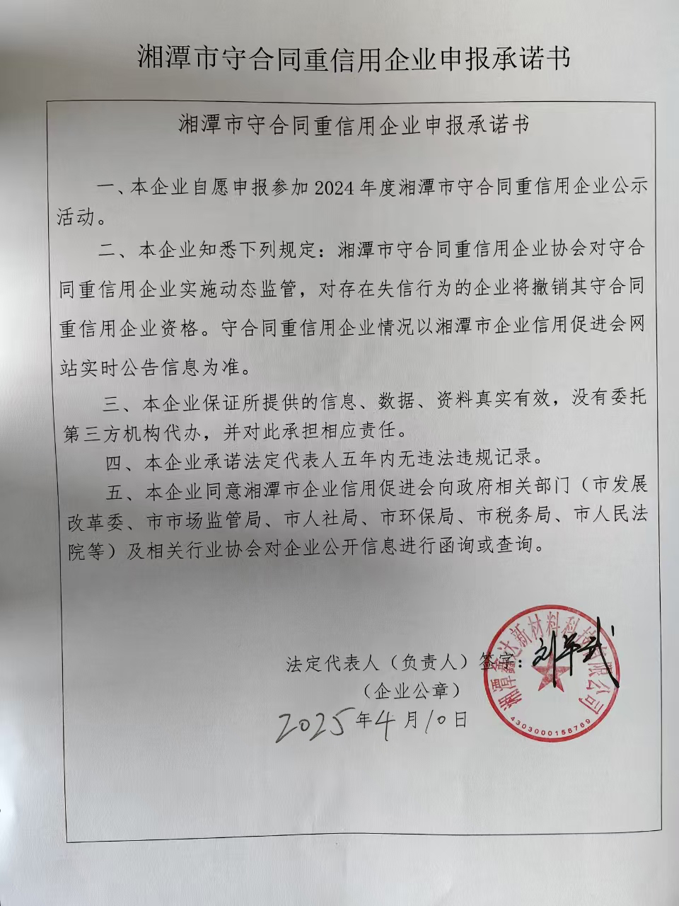 本企業(yè)根據(jù)《湘潭市守合同重信用企業(yè)申報(bào)規(guī)定》等編制 2024 年度企業(yè)信用報(bào)告書(shū),并保證本報(bào)告書(shū)內(nèi)容真實(shí)、準(zhǔn)確、完整。