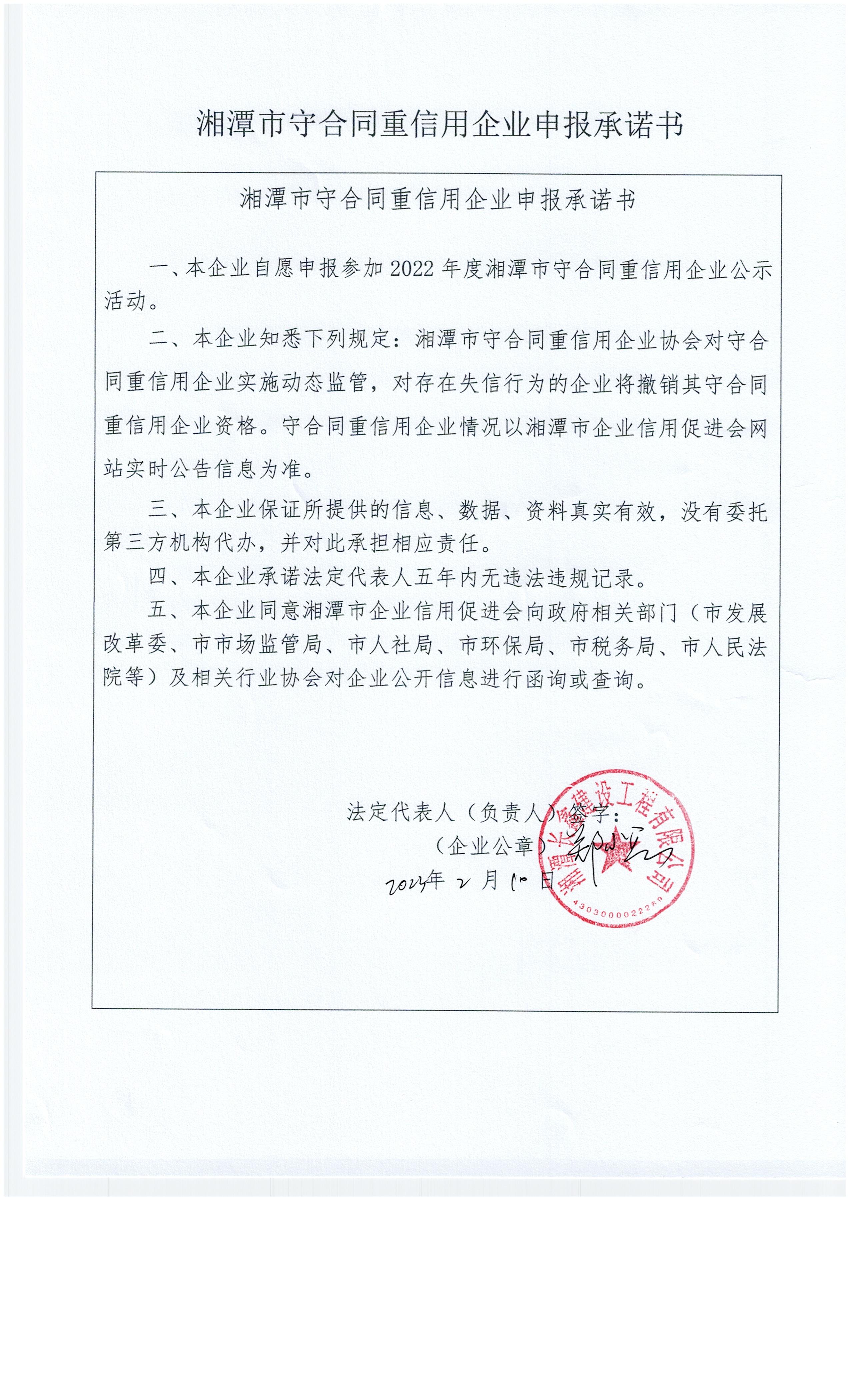 本企業(yè)根據(jù)《湘潭市守合同重信用企業(yè)申報規(guī)定》等編制 2022 年度企業(yè)信用報告書,并保證本報告書內(nèi)容真實、準確、完整。